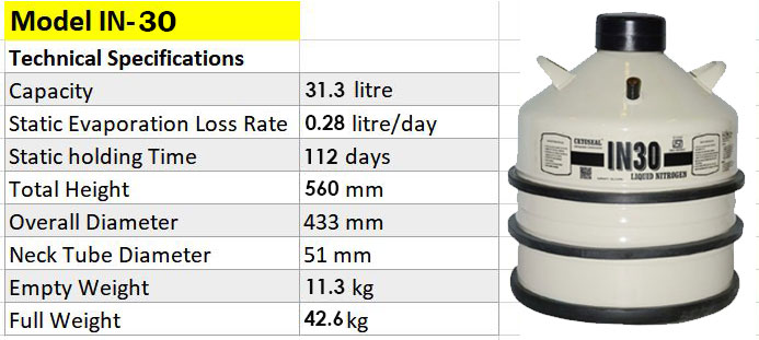 Capacity 47 litres |Static Evaporation Loss Rate 0.37 litre/day |Static holding Time 127 days| Working Time 79 days |Total Height 690 mm |Overall Diameter 485 mm| Neck Tube Diameter 120 mm |Empty Weight 17.5 kg| Full Weight 55.5 kg |No. of Canisters 11 nos |Canister OD 72 mm |Canister Height 280 mm |Straw Holding Capacity Double Level 0.25 ml – 18000 nos 0.50 ml – 8000 nos